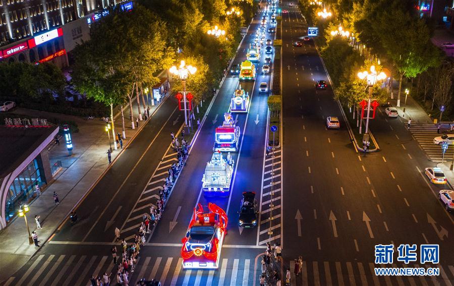 6月19日,花車(chē)在長(zhǎng)春市人民大街上巡游(無(wú)人機(jī)照片)。