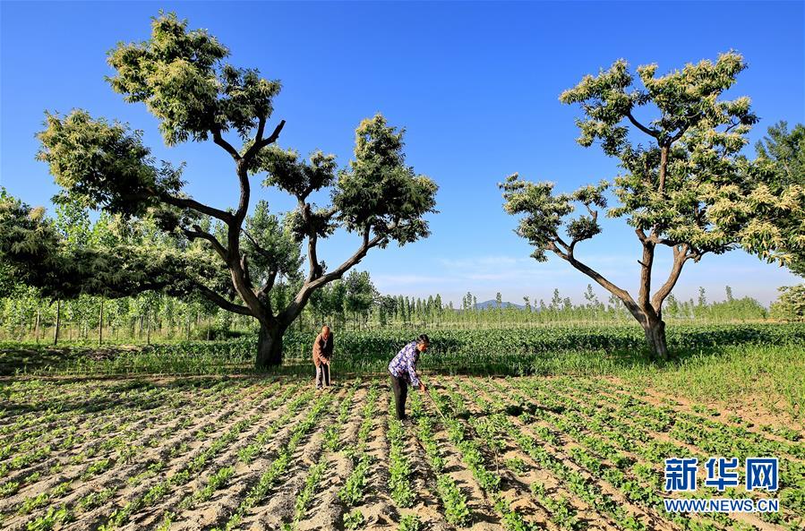 6月21日,河北省遷西縣東荒峪鎮(zhèn)大店子村農(nóng)民在板栗樹旁的種植田內(nèi)勞作。新華社記者牟宇攝