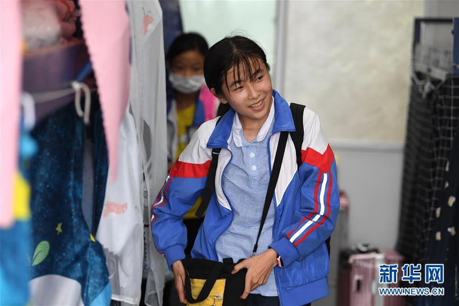 6月19日,在金寨縣三合實驗學(xué)校宿舍,蔡齊艷放學(xué)后收拾行李準(zhǔn)備回家過周末。新華社記者劉軍喜攝