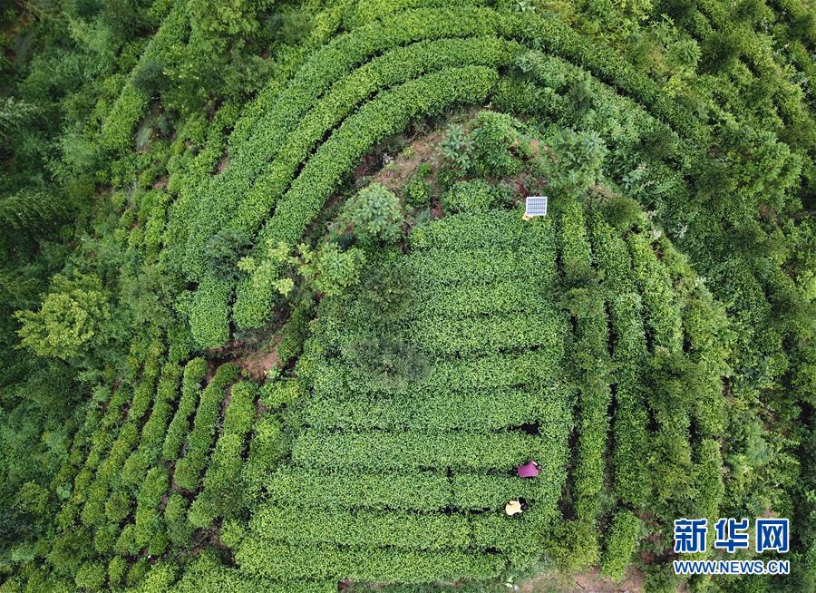 蔡齊艷和爸爸蔡守偉在自家茶園里拔草(6月20日無(wú)人機(jī)照片)。新華社記者張端攝