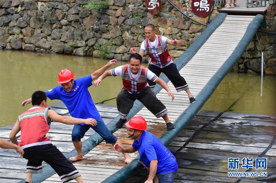 在廣西融水雙龍溝森林旅游度假區(qū)夢嗚苗寨,幾位搬遷戶協助游客挑戰(zhàn)“搖擺橋”(6月21日攝)。近年來,融水打造原生態(tài)苗族文化體驗園——夢嗚苗寨,讓搬遷進城的貧困戶住進復原建設的老房子。景區(qū)提供綠化保潔、游樂設施管理、民族歌舞表演等工作崗位,多渠道增加貧困戶收入。