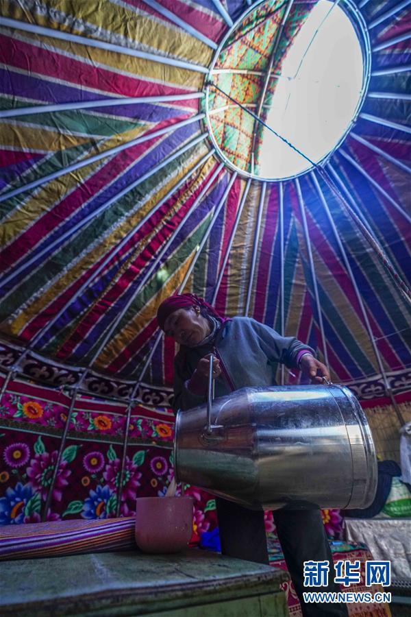 在吉木乃縣萬(wàn)駝園內(nèi),一位牧民將一部分駝奶倒出留作自己食用(6月21日攝)。新華社記者趙戈攝