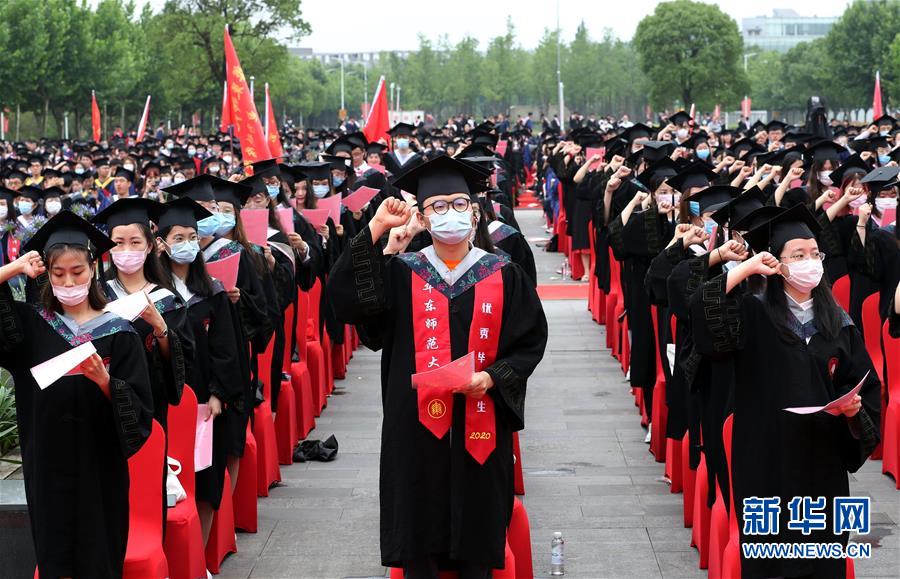 6月23日,在華東師范大學(xué)閔行校區(qū)的畢業(yè)典禮上,師范專業(yè)的畢業(yè)生舉行宣誓儀式。當(dāng)日,華東師范大學(xué)舉行2020屆畢業(yè)典禮。由于疫情防控需要,今年的典禮在兩個校區(qū)分別舉辦,并全程在線直播。約7700名華東師范大學(xué)2020屆畢業(yè)生通過現(xiàn)場或“云端”的方式參加畢業(yè)典禮。新華社記者劉穎攝