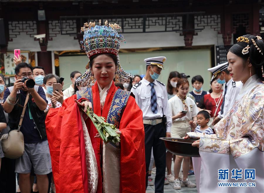 6月24日,在上海豫園舉辦的端午花神國(guó)風(fēng)廟會(huì)上,身著古裝的演員在表演。端午節(jié)臨近,各地舉行包粽子、做香包、賽龍舟等豐富多彩的民俗文化活動(dòng),迎接傳統(tǒng)佳節(jié)的到來(lái)。新華社記者劉穎攝