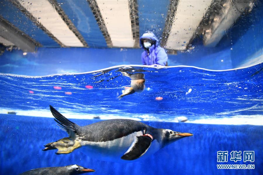 6月24日,哈爾濱極地館的工作人員為水中的企鵝投放“魚粽”。當(dāng)日,哈爾濱極地館的工作人員特地準(zhǔn)備了“魚粽”“肉粽”,讓生活在這里的極地動物也品嘗一下端午美食。新華社記者王建威攝