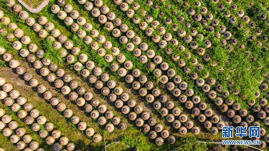 赤水曾氏曬醋廠晾曬的醋壇(6月26日攝,無人機(jī)照片)?!俺嗨畷翊住辈捎霉腆w發(fā)酵繁殖產(chǎn)生天然醋酸菌,醋醅和成品醋都在日光下曝曬而成,故稱曬醋?!俺嗨畷翊住敝谱鳉v史悠久,工序考究,2009年被列入貴州省級(jí)非遺名錄。新華社記者 陶亮 攝