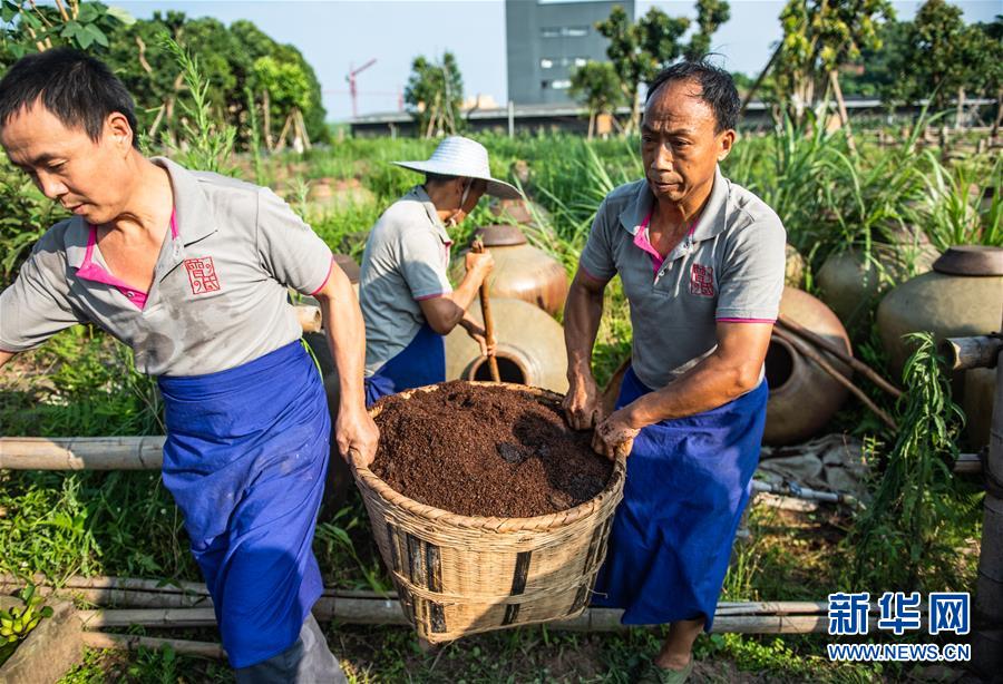 6月26日,工人在曾氏曬醋廠翻取醋醅。新華社記者 陶亮 攝
