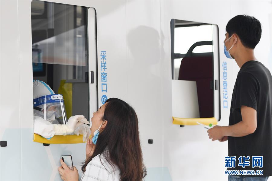 6月28日,在北京市西城區(qū)北京展覽館南側(cè)的露天廣場核酸檢測采樣點,核酸檢測采樣車內(nèi)的醫(yī)護人員為前來做檢測的人員進行采樣。新華社記者鞠煥宗攝