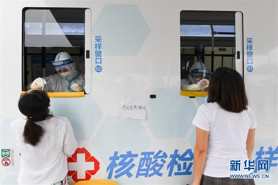 6月28日,在北京市西城區(qū)北京展覽館南側(cè)的露天廣場核酸檢測采樣點(diǎn),核酸檢測采樣車內(nèi)的醫(yī)護(hù)人員為前來做檢測的人員進(jìn)行采樣。新華社記者鞠煥宗攝