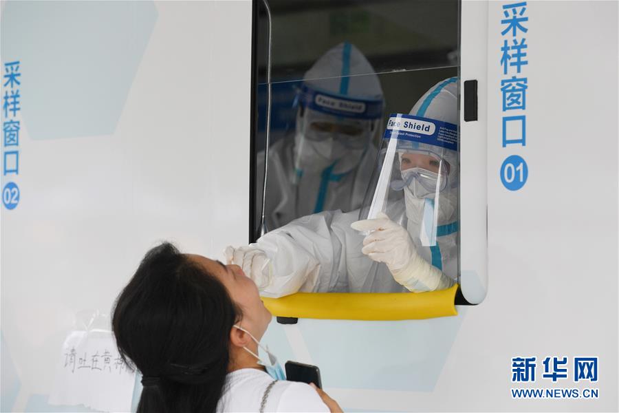 6月28日,在北京市西城區(qū)北京展覽館南側(cè)的露天廣場核酸檢測采樣點,核酸檢測采樣車內(nèi)的醫(yī)護人員為前來做檢測的人員進(jìn)行采樣。新華社記者鞠煥宗攝