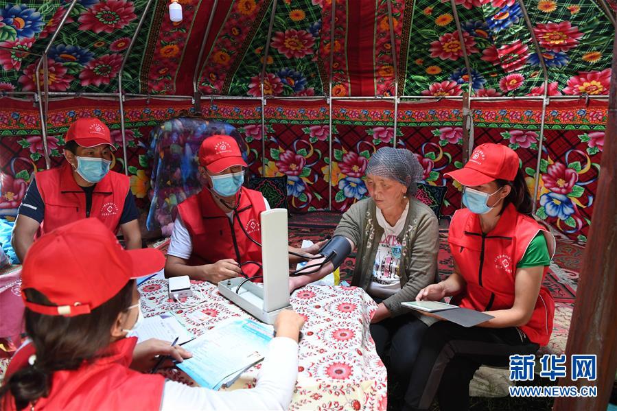 新疆布爾津縣也格孜托別鄉(xiāng)衛(wèi)生院全科醫(yī)生哈納提別克·沙旦(右三)給牧民巴合提古麗·塔拉甫汗檢查身體。新華社記者沙達提攝