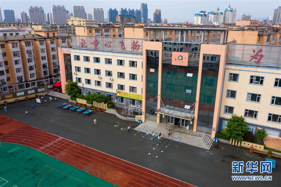 6月29日,在吉林市第一實驗小學(xué),學(xué)生陸續(xù)進(jìn)入教學(xué)樓(無人機照片)。新華社記者張楠攝