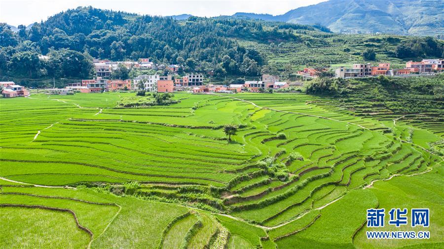 貴州省盤州市新民鎮(zhèn)的梯田風(fēng)光(6月29日攝,無人機(jī)照片)。夏日時節(jié),貴州省盤州市新民鎮(zhèn)的梯田風(fēng)景如畫。新華社記者陶亮攝