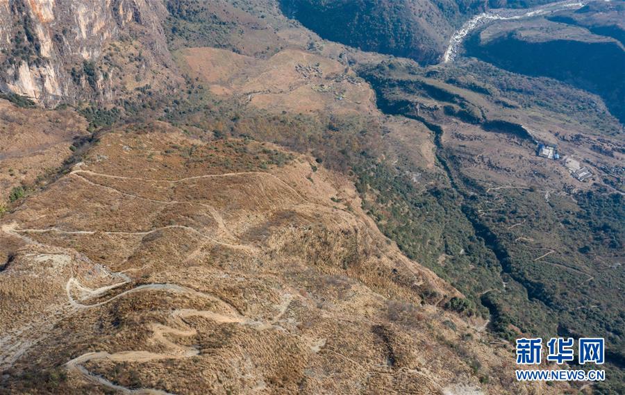 俯瞰通往阿布洛哈村的羊腸小道(2019年12月27日攝,無人機照片)。新華社記者江宏景攝