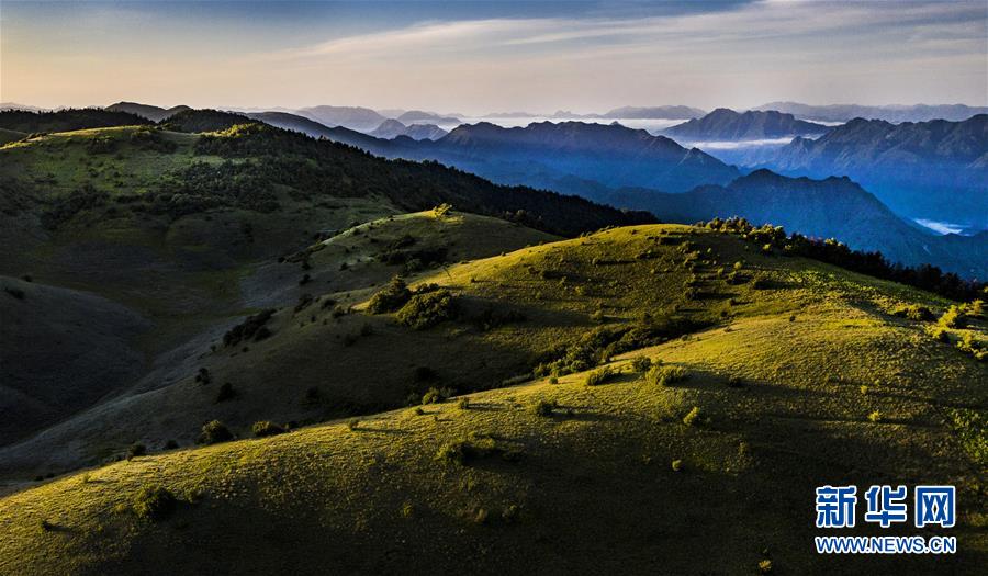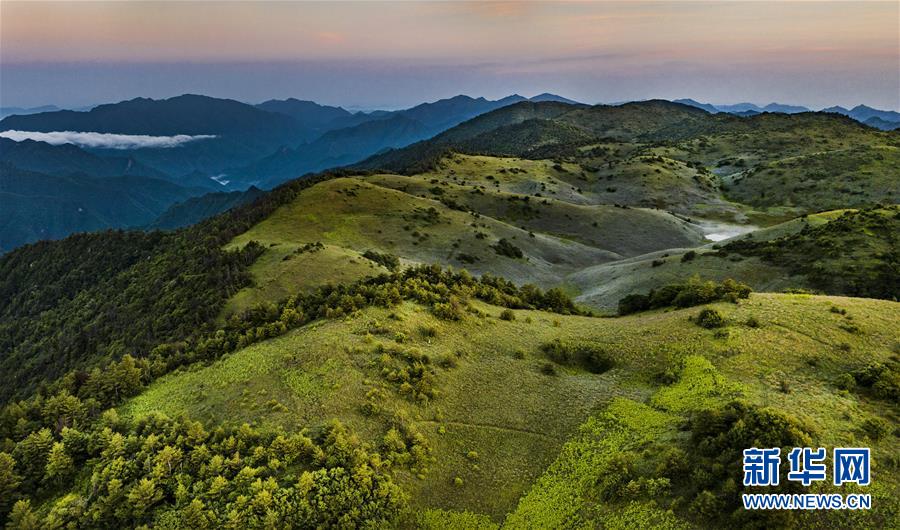 6月30日,朝霞照耀下的神田草甸與遠(yuǎn)處的群峰(無人機照片)。位于陜西省安康市嵐皋縣與重慶市城口縣交界處大巴山神田主脊北坡的神田草甸,面積超過1.1萬畝。夏日的朝霞中,起伏的草甸仿佛一塊寬大無邊的綠色地毯,鑲嵌在大巴山上,如詩如畫。新華社記者陶明攝