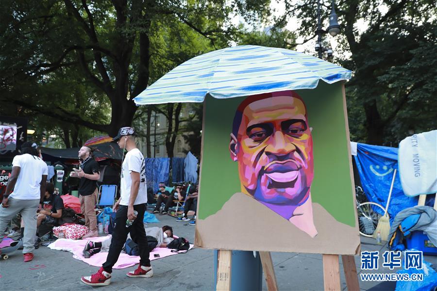這是6月30日在美國紐約市政廳外“占領(lǐng)市政廳”抗議活動現(xiàn)場拍攝的弗洛伊德畫像。由美國明尼蘇達州明尼阿波利斯市非裔男子弗洛伊德遭白人警察暴力執(zhí)法而死一事引發(fā)的各種抗議活動仍在紐約持續(xù)進行。新華社記者王迎攝