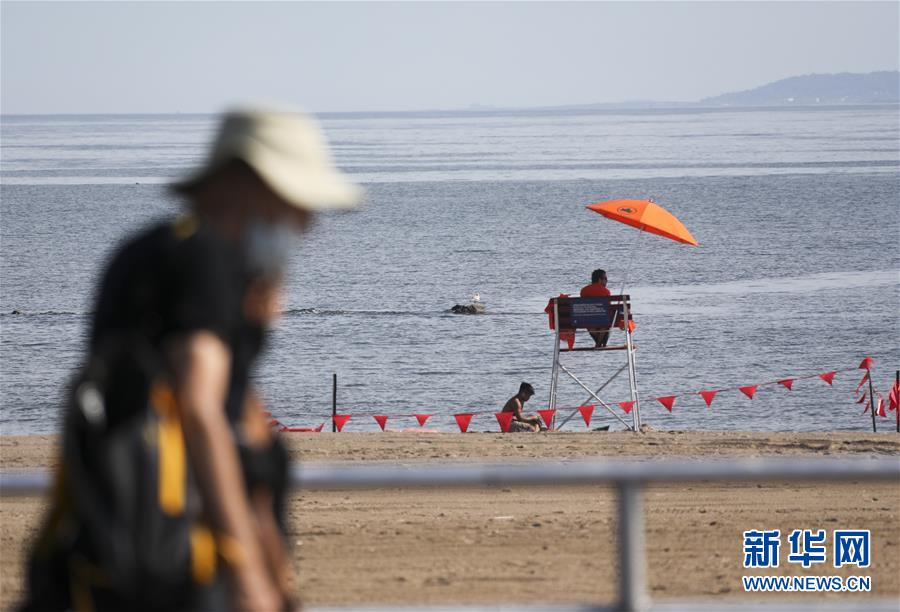 7月1日,救生員在美國(guó)紐約科尼島的一處海灘查看海面情況。當(dāng)日,美國(guó)紐約市屬八處海灘正式重新準(zhǔn)許民眾游泳,救生員也同時(shí)上崗。新華社記者王迎攝