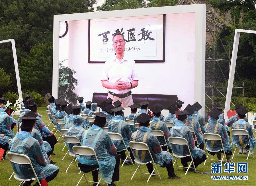 7月2日,2020屆畢業(yè)生在畢業(yè)典禮上觀看校友代表、國家呼吸系統(tǒng)疾病臨床醫(yī)學(xué)研究中心主任鐘南山發(fā)言視頻。當(dāng)日,北京大學(xué)舉行2020年畢業(yè)典禮。由于疫情防控需要,今年的典禮在北京大學(xué)辦公樓西側(cè)廣場(chǎng)、靜園草坪、未名湖等九個(gè)會(huì)場(chǎng)舉行,并面向全球進(jìn)行中英文雙語直播,僅部分在校畢業(yè)生現(xiàn)場(chǎng)參加,更多畢業(yè)生通過線上直播參與畢業(yè)典禮。新華社記者任超攝
