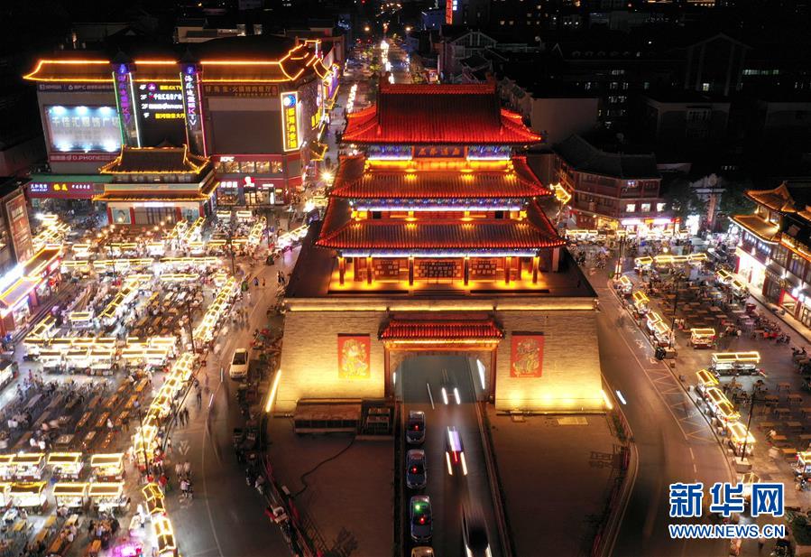 這是6月1日拍攝的河南開(kāi)封鼓樓夜市(無(wú)人機(jī)照片)。新華社記者 李安 攝