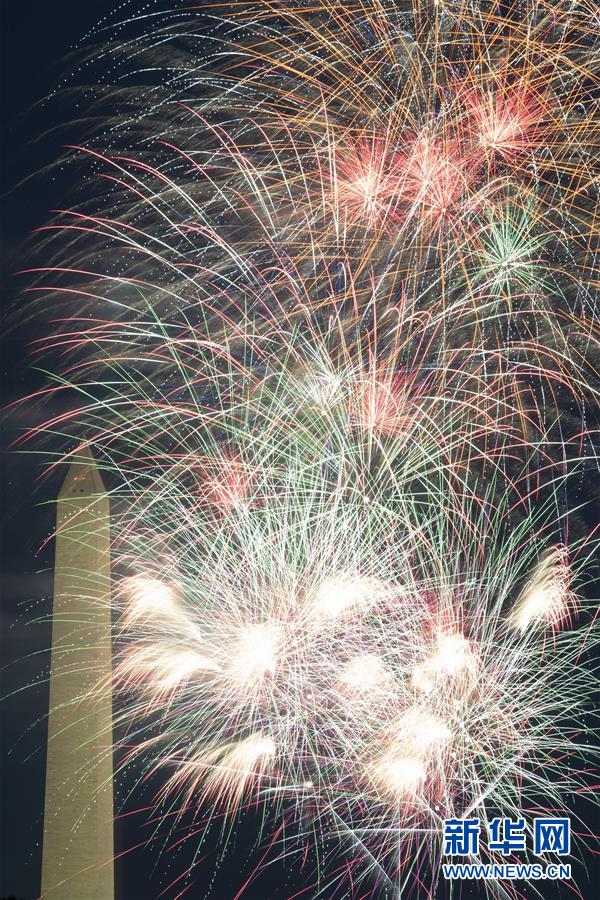 7月4日,焰火在美國華盛頓上空綻放,慶祝美國獨立日。當日是美國獨立日,美國多地疫情仍面臨嚴峻形勢。美國約翰斯·霍普金斯大學實時統(tǒng)計數據顯示,美國累計新冠確診病例4日已超過280萬例。新華社記者劉杰攝