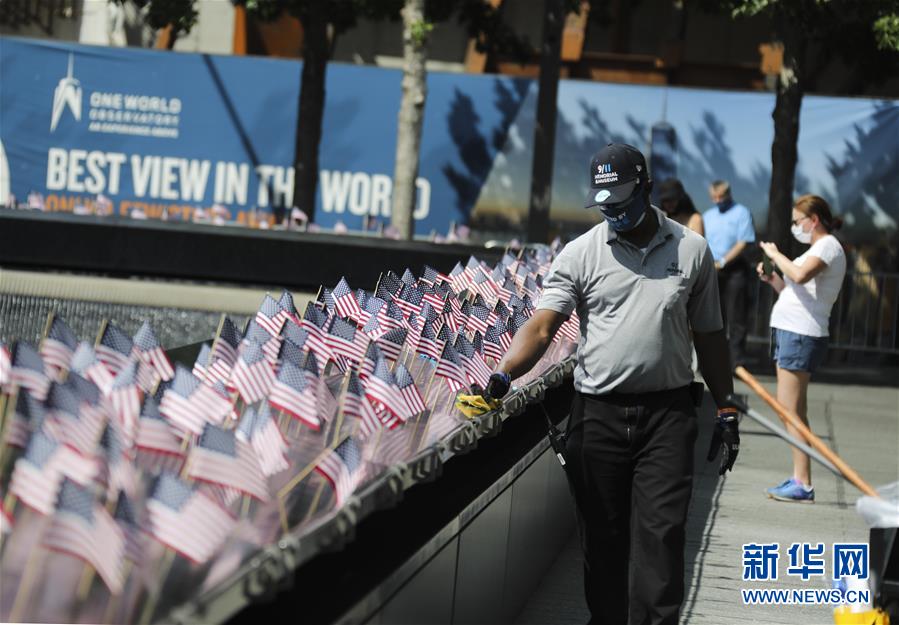 7月4日,工作人員在當日重新開放的美國紐約“9·11”世貿中心遺址做清潔。當日是美國獨立日,美國多地疫情仍面臨嚴峻形勢。美國約翰斯·霍普金斯大學實時統(tǒng)計數據顯示,美國累計新冠確診病例4日已超過280萬例。新華社記者王迎攝