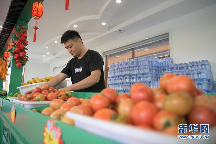 7月5日,在黑龍江省肇東市昌五鎮(zhèn)昌盛村農(nóng)業(yè)生態(tài)觀光園農(nóng)產(chǎn)品展銷區(qū),工作人員在整理果蔬。黑龍江省肇東市昌五鎮(zhèn)昌盛村農(nóng)業(yè)生態(tài)觀光園占地千余畝,融合了種植采摘、民俗產(chǎn)品展銷、旅游觀光等項(xiàng)目,方便周邊農(nóng)民就近就業(yè),助力脫貧增收。新華社記者王建威攝