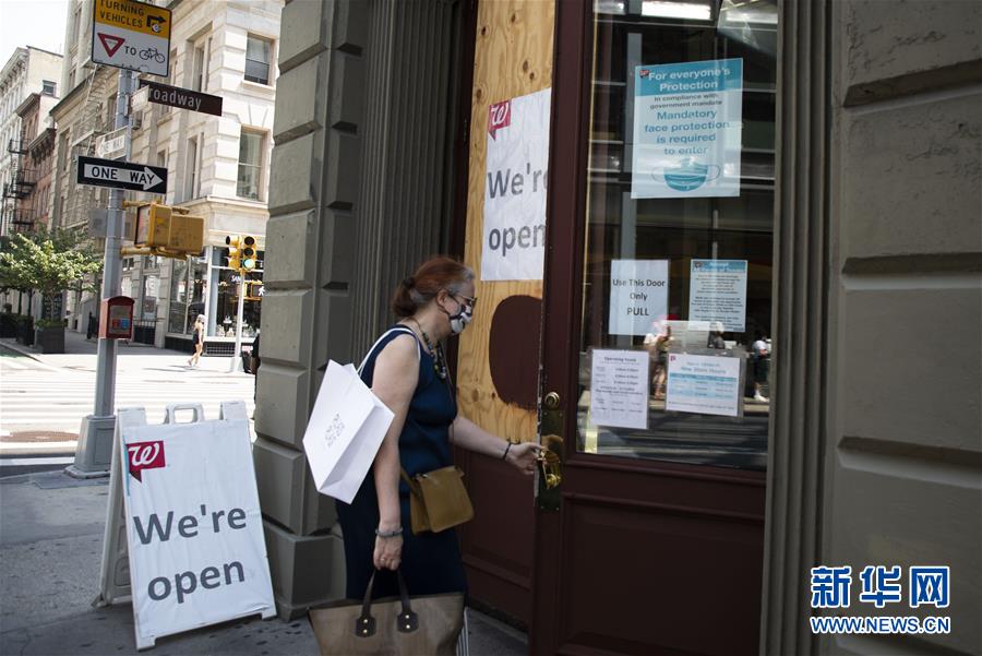 7月6日,佩戴口罩的顧客進(jìn)入美國(guó)紐約的一家超市。新華社記者王迎攝