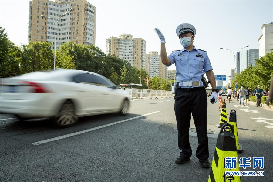 7月7日,在位于北京的中國(guó)人民大學(xué)附屬中學(xué)考點(diǎn)外,北京市公安局公安交通管理局海淀交通支隊(duì)中關(guān)村大隊(duì)交警付云輝在指揮車輛有序行駛。當(dāng)日,2020年高考拉開帷幕。新華社記者沈伯韓攝