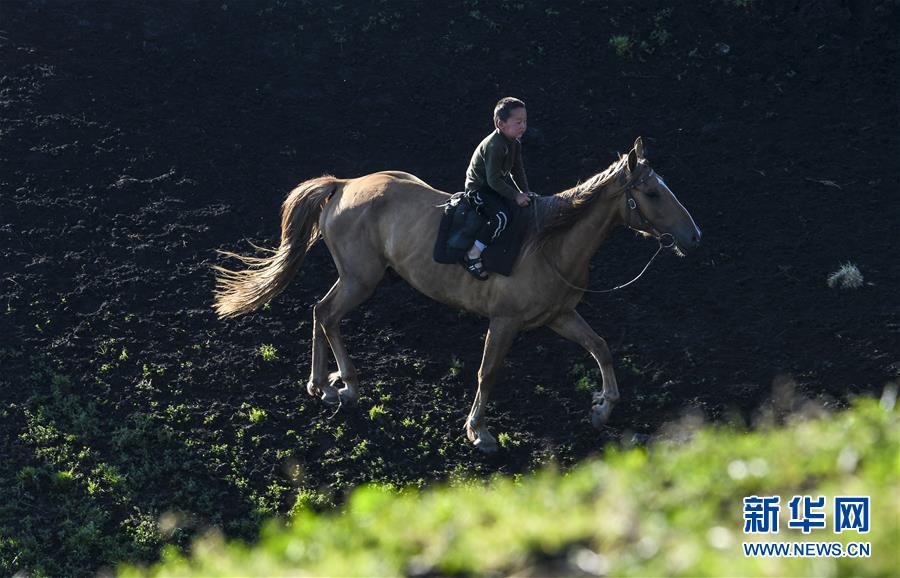 在新疆特克斯縣境內的夏牧場里,一名小朋友在草場上騎馬(7月2日攝)。新華社記者王菲攝