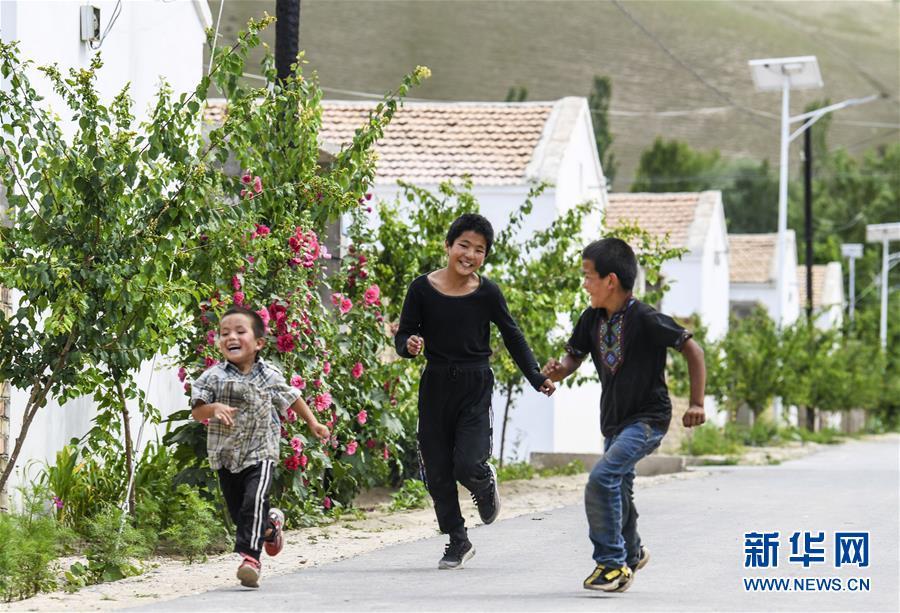 在新疆特克斯縣境內(nèi)的牧民定居點,小朋友在巷道內(nèi)追逐玩耍(7月6日攝)。新華社記者王菲攝