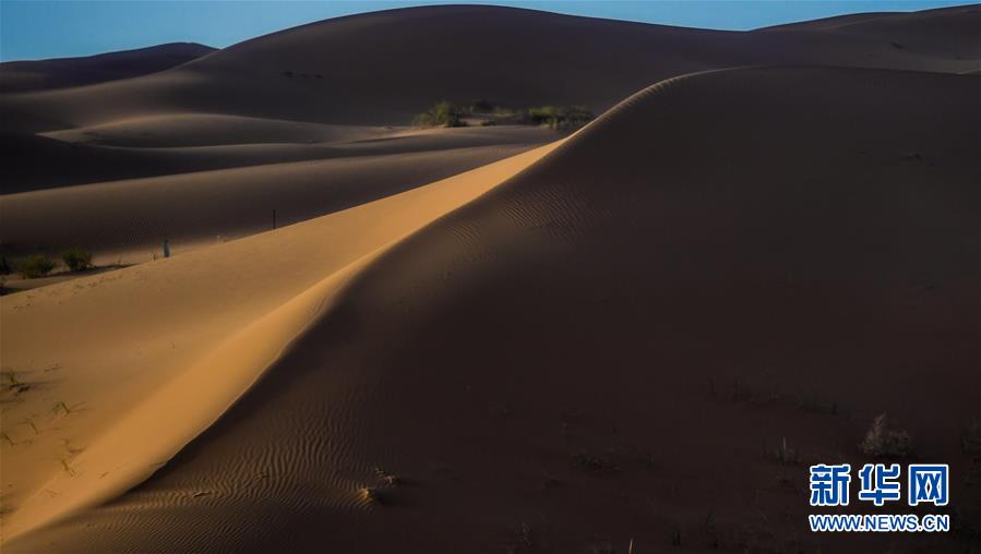 這是7月8日拍攝的騰格里沙漠風光。位于內(nèi)蒙古自治區(qū)阿拉善左旗西南部和甘肅省中部邊境的騰格里沙漠是我國第四大沙漠,總面積約為4.3萬平方公里。夏日傍晚,騰格里沙漠連綿的沙丘被日光勾勒出美麗的線條,美不勝收。新華社記者連振攝