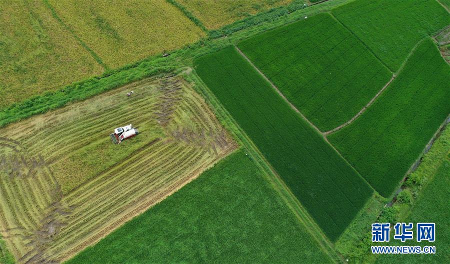 7月11日,在湖南省衡陽市衡陽縣臺(tái)源鎮(zhèn)臺(tái)九村,村民駕駛收割機(jī)收割早稻(無人機(jī)照片)。近日,湖南各地農(nóng)村陸續(xù)進(jìn)入“雙搶”季,農(nóng)民緊抓農(nóng)時(shí),搶收搶種,力爭糧食穩(wěn)產(chǎn)豐收。新華社記者趙眾志攝