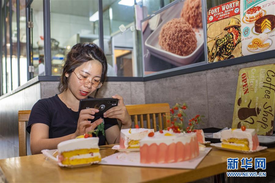 在位于新疆精河縣城的一家糕點(diǎn)店,朱虹美在錄制視頻,介紹創(chuàng)意食品——由枸杞果醬、鮮枸杞制作的“枸杞蛋糕”(7月11日攝)。朱虹美計(jì)劃聯(lián)合精河其他行業(yè),一起推廣枸杞。新華社記者 胡虎虎 攝