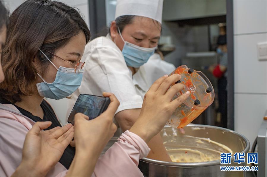 在位于新疆精河縣城的一家糕點(diǎn)店,朱虹美團(tuán)隊在錄制視頻,介紹創(chuàng)意食品——由枸杞果醬、鮮枸杞制作的“枸杞蛋糕”(7月11日攝)。新華社記者 胡虎虎 攝