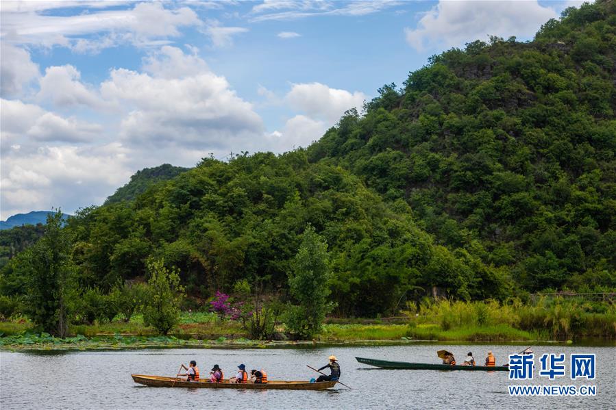 游人在普者黑國家濕地公園泛舟賞景(7月8日攝)。新華社記者 秦晴 攝