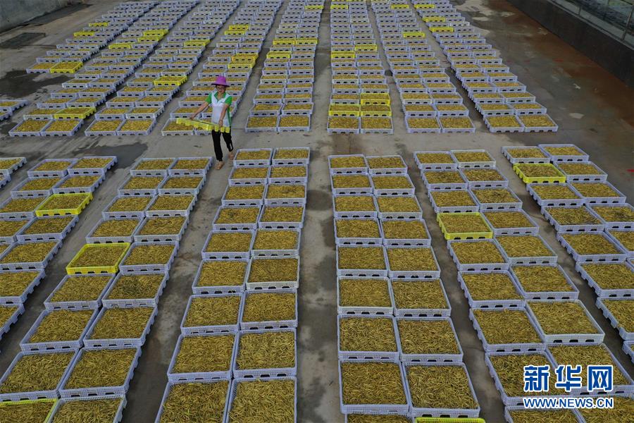 7月12日,祁東縣黃土鋪鎮(zhèn)雁隆食品公司內,工人在晾曬黃花菜(無人機照片)。新華社記者 趙眾志 攝