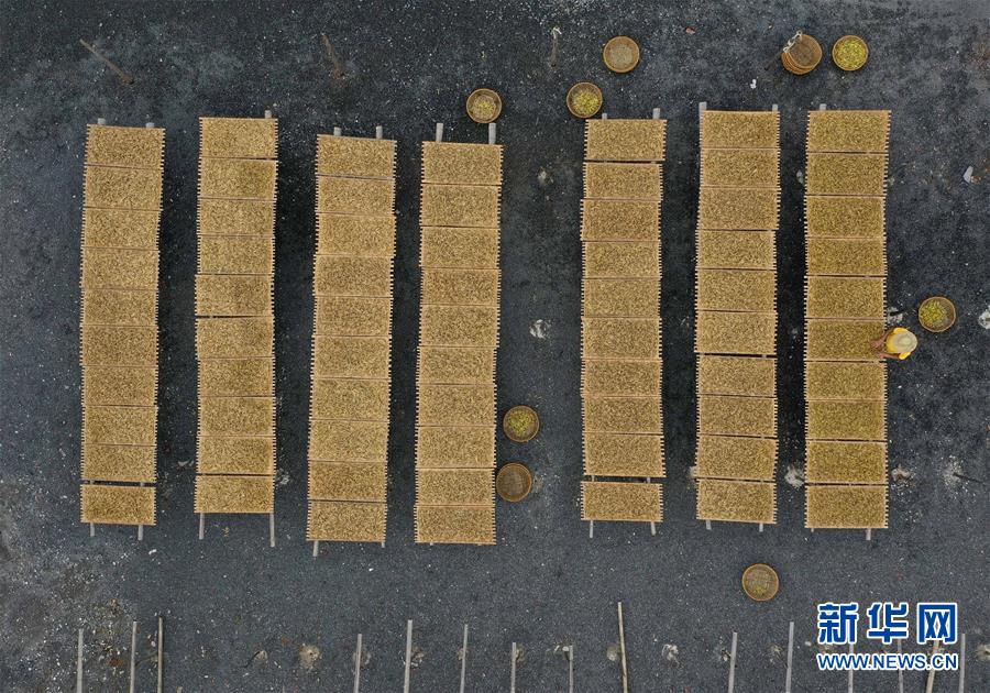 7月12日,祁東縣黃土鋪鎮(zhèn)雷公殿村,村民在晾曬黃花菜(無人機照片)。新華社記者 趙眾志 攝