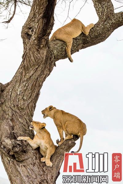 2020年7月13日?qǐng)?bào)道(具體拍攝時(shí)間不詳),Sandesh Kadur是一名印度野生動(dòng)物攝影師,他在坦桑尼亞塞倫蓋蒂國(guó)家公園拍攝到一系列“獅子上樹”的精彩照片。畫面中,有一只憤怒的母獅為了捍衛(wèi)自己在樹上的位置,一邊劈叉一邊對(duì)著鏡頭咆哮,有兩只獅子為了爭(zhēng)奪位置互相攻擊,還有一只獅子在找到舒適的位置后呼呼大睡。