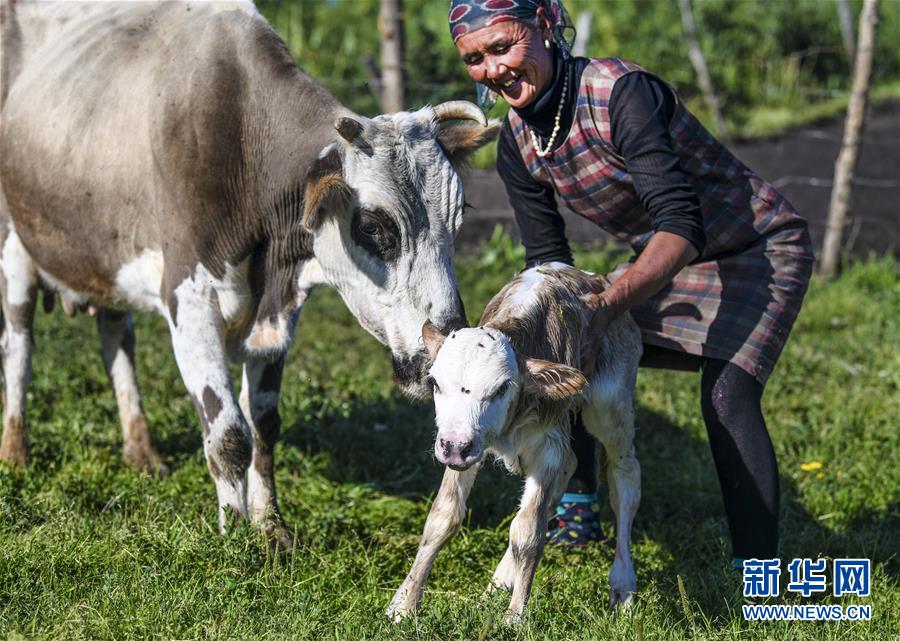 在新疆伊犁特克斯縣境內(nèi)的夏牧場(chǎng)里,一位牧民幫助剛剛出生的牛犢站起來(7月2日攝)。新華社記者 王菲 攝