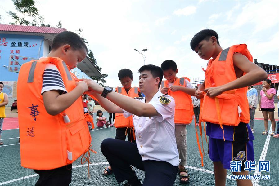 7月13日,在廣西融水苗族自治縣桿洞鄉(xiāng)黨鳩小學(xué),融水海事處工作人員指導(dǎo)學(xué)生穿救生衣。當(dāng)日,廣西柳州融水海事處在桿洞鄉(xiāng)黨鳩小學(xué)開展防溺水及水上交通安全知識(shí)教育活動(dòng),向?qū)W生們普及水上安全知識(shí),并講解水上應(yīng)急救援技能。新華社記者 黃孝邦 攝