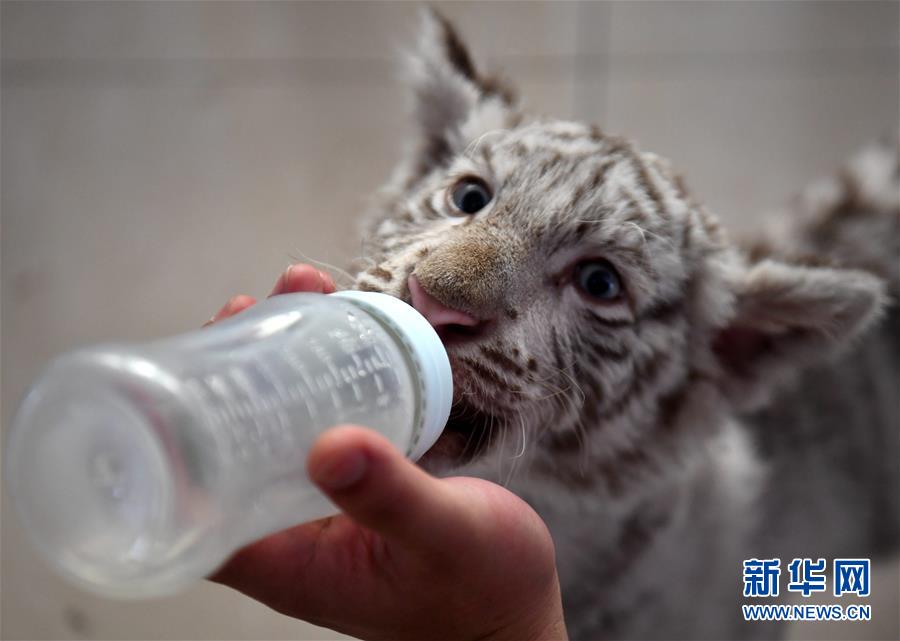 7月13日,工作人員給“妞妞”喂水。河北石家莊市動物園的孟加拉白虎寶寶“妞妞”只有3個月大,由于虎媽媽經(jīng)驗(yàn)不足,“妞妞”一出生便由動物園工作人員按科學(xué)方法人工飼養(yǎng)。目前,在飼養(yǎng)員的精心照料下,“妞妞”正在茁壯成長。新華社記者 王曉 攝