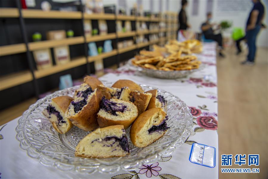 7月13日在新疆精河縣精河鎮(zhèn)馕文化產(chǎn)業(yè)示范基地拍攝的供顧客品嘗的“黑枸杞馕”。近日,新疆精河縣10萬余畝枸杞陸續(xù)成熟,當(dāng)?shù)剞r(nóng)民搶抓農(nóng)時,采收枸杞。近年來,精河縣持續(xù)發(fā)展和培育枸杞“紅色產(chǎn)業(yè)鏈”,加大資金扶持力度,提升精河枸杞的品牌效應(yīng),帶動農(nóng)民增收致富。精河縣位于新疆天山山脈北麓,準(zhǔn)噶爾盆地西南邊緣。當(dāng)?shù)厝照諘r間長、晝夜溫差大且氣候干燥,有利于枸杞果實(shí)糖分和藥用成分積累。新華社記者 胡虎虎 攝