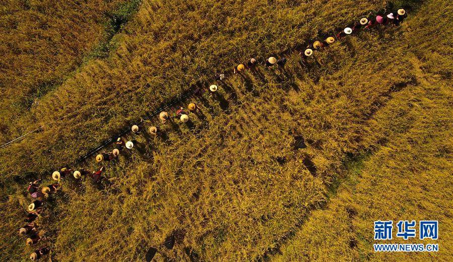 村民在海南省白沙黎族自治縣青松鄉(xiāng)擁處村的山蘭稻田內(nèi)收割山蘭稻(2019年11月17日,無(wú)人機(jī)照片)。新華社記者楊冠宇攝