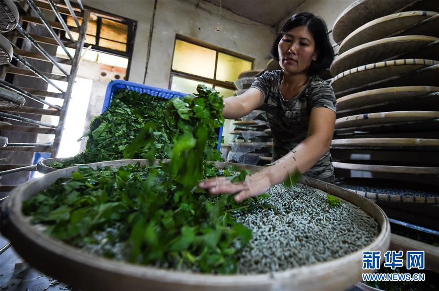 海南省瓊中黎族苗族自治縣灣嶺鎮(zhèn)灣嶺蠶繭站工作人員在喂養(yǎng)細(xì)蠶(2018年8月23日攝)。新華社記者楊冠宇攝