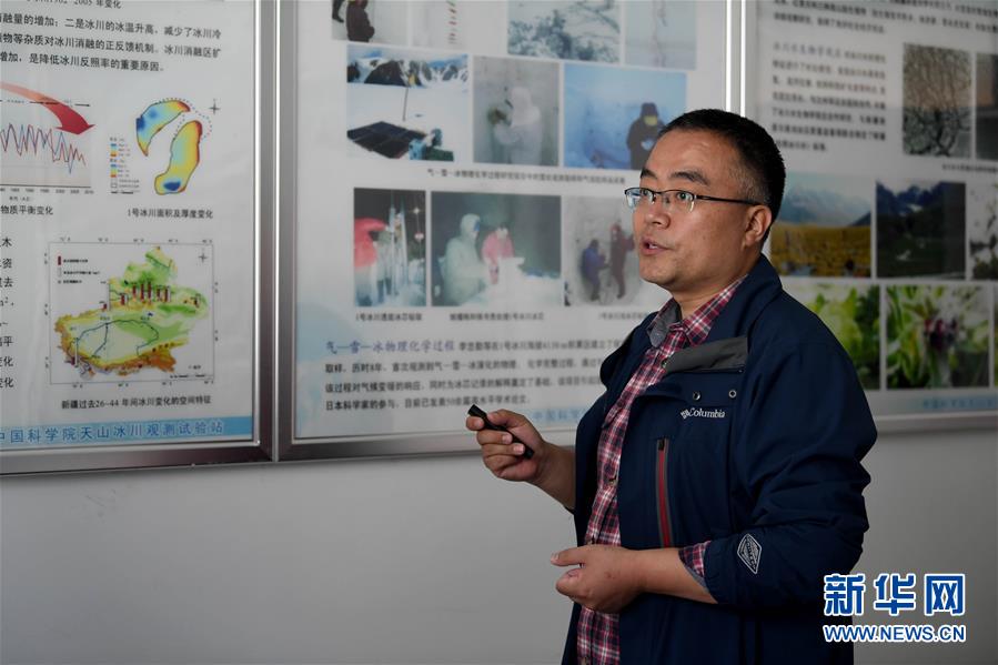 7月16日,中國科學(xué)院西北生態(tài)環(huán)境資源研究院天山冰川觀測(cè)試驗(yàn)站工程師周平介紹天山一號(hào)冰川情況。新華社記者沙達(dá)提攝