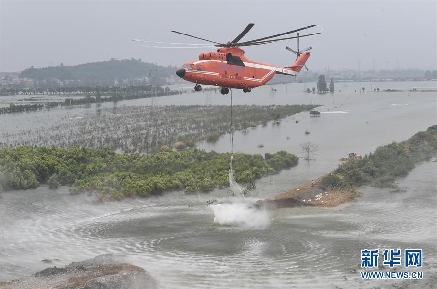 7月16日,湖北省應(yīng)急管理廳緊急調(diào)度直升機(jī),在湖北省陽新縣富河干堤葵賽湖下垸潰口上空,空投網(wǎng)兜石塊。新華社記者程敏攝