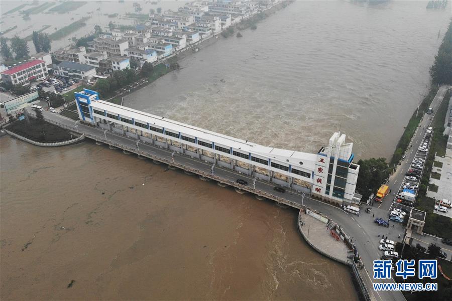 7月20日,洪水通過王家壩閘涌入蒙洼蓄洪區(qū)(無人機(jī)照片)。當(dāng)日8時(shí)32分,淮河干流王家壩閘開閘泄洪。受近期強(qiáng)降雨影響,淮河干流王家壩站水位19日快速上漲,7月20日6時(shí)36分水位漲至29.66米,超過保證水位0.36米?;春油跫覊伍l開閘泄洪,蒙洼蓄洪區(qū)啟用。新華社記者黃博涵攝