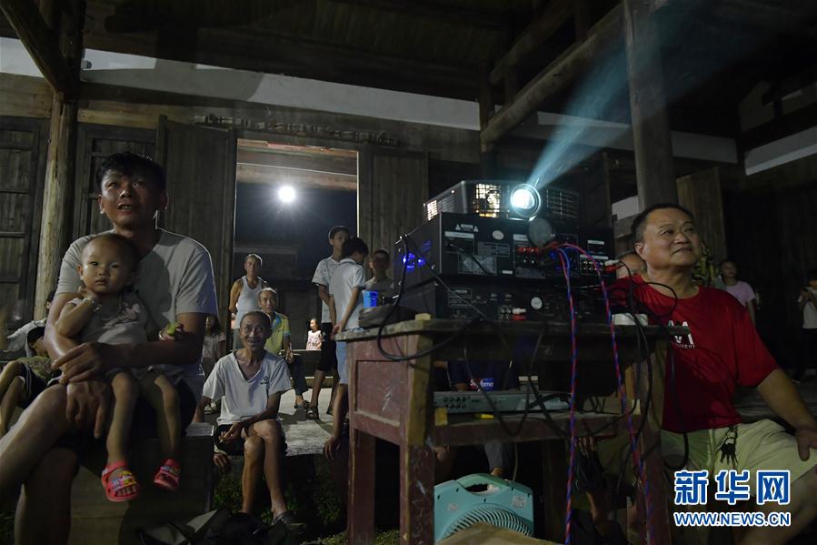 2019年7月2日,在江西省吉安市峽江縣水邊鎮(zhèn)湖洲村,謝萍果(前右)在為村民放電影。