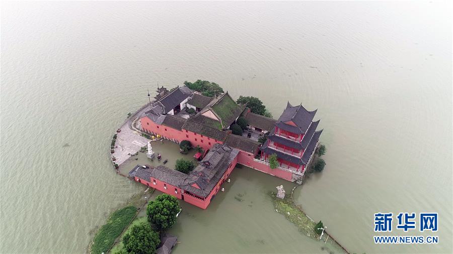 7月21日在安徽省合肥市巢湖邊拍攝的被水淹的建筑(無人機(jī)照片)。當(dāng)日10時(shí)24分,巢湖中廟站水位達(dá)到13.36米,該水位系巢湖洪水設(shè)防的百年一遇標(biāo)準(zhǔn)。新華社記者屈彥攝