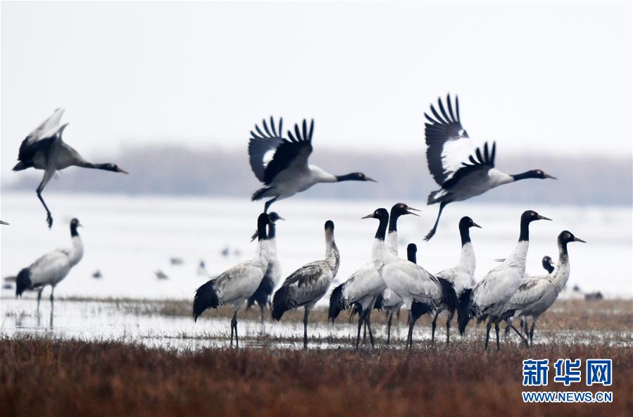 在草海國(guó)家級(jí)自然保護(hù)區(qū)越冬的黑頸鶴(2019年12月11日攝)。新華社記者楊文斌攝